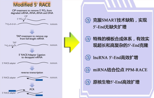 (1) 修飾的5’-RACE技術(shù):在經(jīng)典5’-RACE基礎(chǔ)上,進(jìn)行了諸多改進(jìn),如加入增強(qiáng)劑,選取耐高溫、高效逆轉(zhuǎn)錄酶,以及縮短每步RNA沉淀過(guò)程,減少RNA降解等方式,有效實(shí)現(xiàn)了超長(zhǎng)、特殊結(jié)構(gòu)5’-RACE片段的獲取;