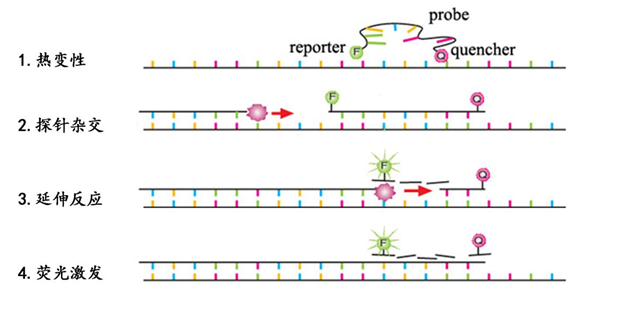 Taqman探針?lè)ǎ?/span>5末端連接熒光基團(tuán),3端末端連接猝滅基團(tuán),PCR擴(kuò)增時(shí),兩個(gè)基團(tuán)相互分離,熒光基團(tuán)得以檢測(cè)。